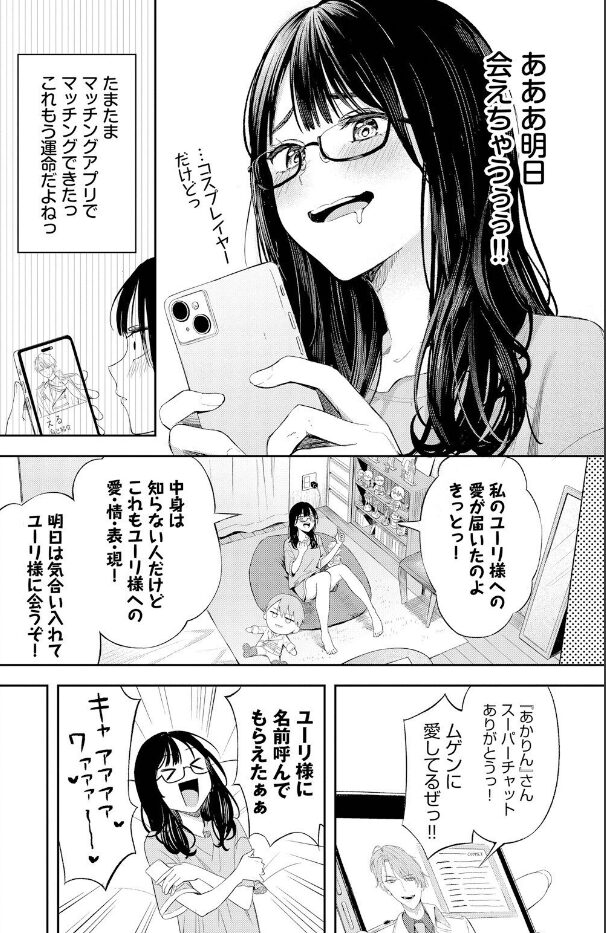 配信に夢中な日々の中、奇跡的にユーリ様のコスプレイヤーとマッチングアプリで繋がってしまう。