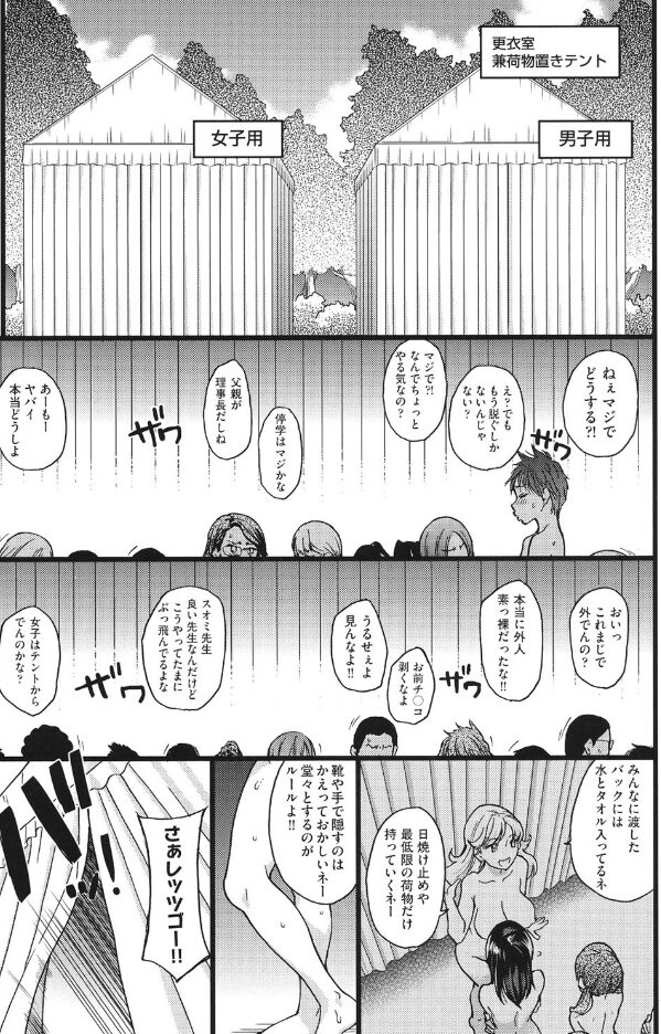 【エロ漫画】修学旅行でヌーディストビーチにきた学生。男子だけではなく女子もいる。初めて見るおっぱいに興奮して立ち上がる男子達。鎮める為に女子は協力する