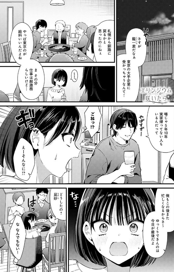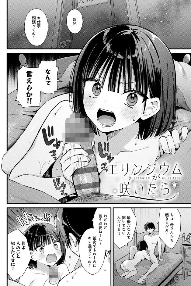 『エリンジウムが咲いたら』想いを寄せる龍一にオナニーを見られた挙句、「お詫びに兄ちゃんがイかせてやろっか?」なんて言われてしまった凪砂。好きと言い出せないまま始まってしまった体の関係。素直になれずにいた所へ龍一の東京行きが決まってしまう。突然のことに戸惑う凪砂は、最後となるエッチで「もう、隠すのやめる…」と本音をぶつけ、初めて互いの気持ちを確かめ合ってーー。